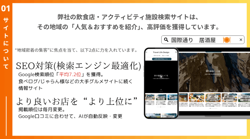 そこで私たちは、掲載料金は全店舗一律、そして掲載順位はGoogle口コミをAIで分析し、毎月変更するシステムを導入いたしました。