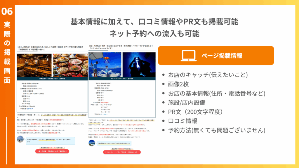 実際の掲載画面は、基本情報に加えて、お店の想い・ウリが伝えられる造りになっています。